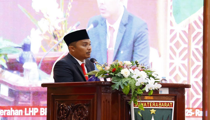 Laporan Hasil Pemeriksaan (LHP) atas LKPD Provinsi Sumbar Tahun 2024 diserahkan Kepala BPK RI Perwakilan Sumbar, Sudarminto Eko Putra kepada Wakil Gubernur Sumbar Vasko Ruseimy dan Ketua DPRD Sumbar Muhidi di Ruang Sidang Utama Gedung DPRD Sumbar, Jumat (23/05/2025).